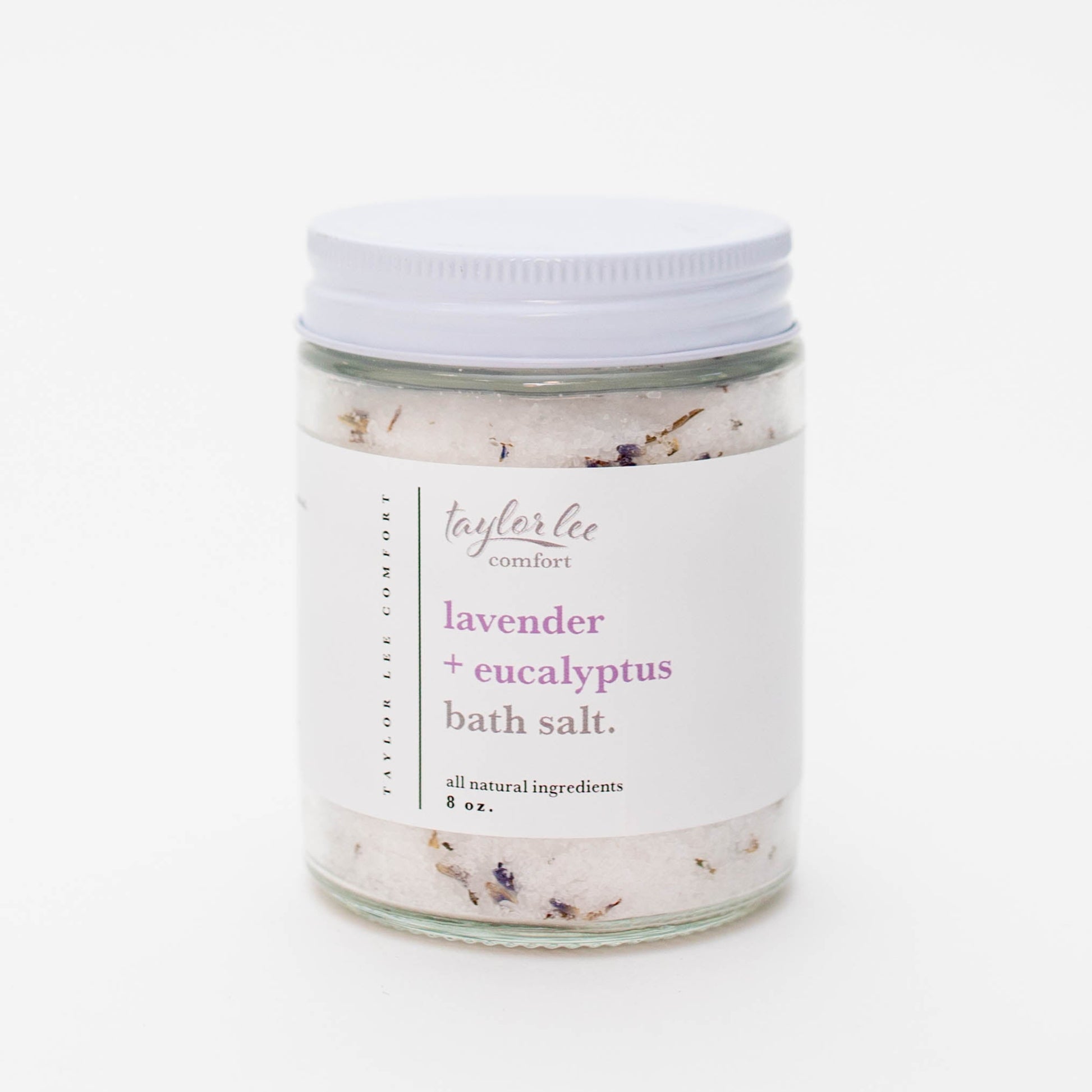 Ingredients: Epsom Salt, Vitamin E Oil, Sweet Almond Oil, Lavender Essential Oil, Eucalyptus Essential Oil, Dried Lavender Buds