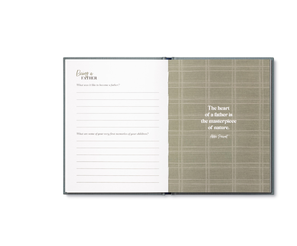 Inside are meaningful questions for Dad to answer — about his childhood, his family, his accomplishments, and his wishes. When complete, this book will become a treasure trove of love and lessons that can be enjoyed for generations.