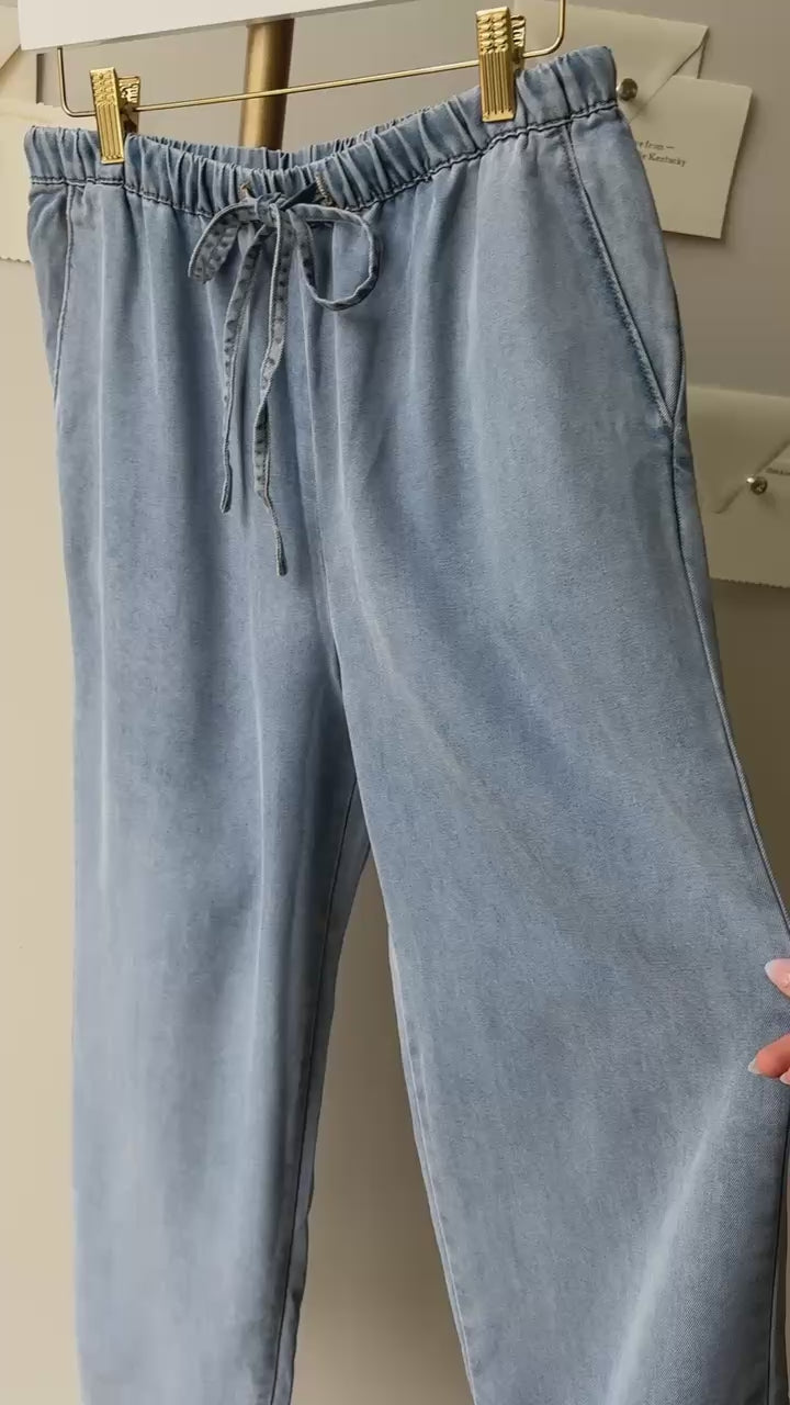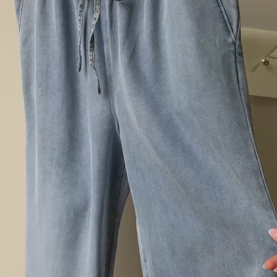 Meet your new everyday favorite: the Drawstring Waistband Wide Leg Jeans designed for unbeatable comfort and effortless style. Made from a luxuriously soft, breathable blend of 65.1% Tencel, 23.7% polyester, and 11.2% viscose, these jeans offer a lightweight feel with beautiful drape and all-day ease. The adjustable drawstring waistband provides a relaxed, flexible fit, while the wide leg silhouette delivers a modern, flattering look that moves with you. Perfect for dressing up or down, these ultra-comfortable jeans feel as good as they look—ideal for casual days, travel, lounging, and everything in between. Once you slip them on, you’ll never want to take them off.